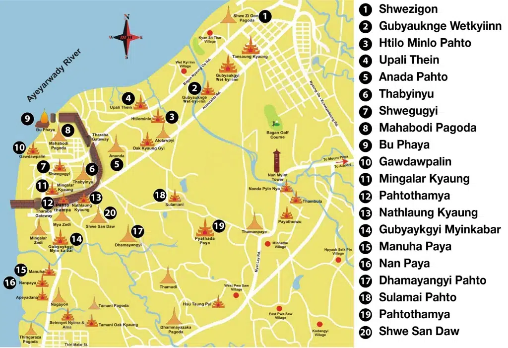 Carte des temples incontournables de Bagan